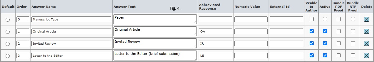 The table labelled Answers (Fig. 4) contains each manuscript type configured for the site along with important metadata.