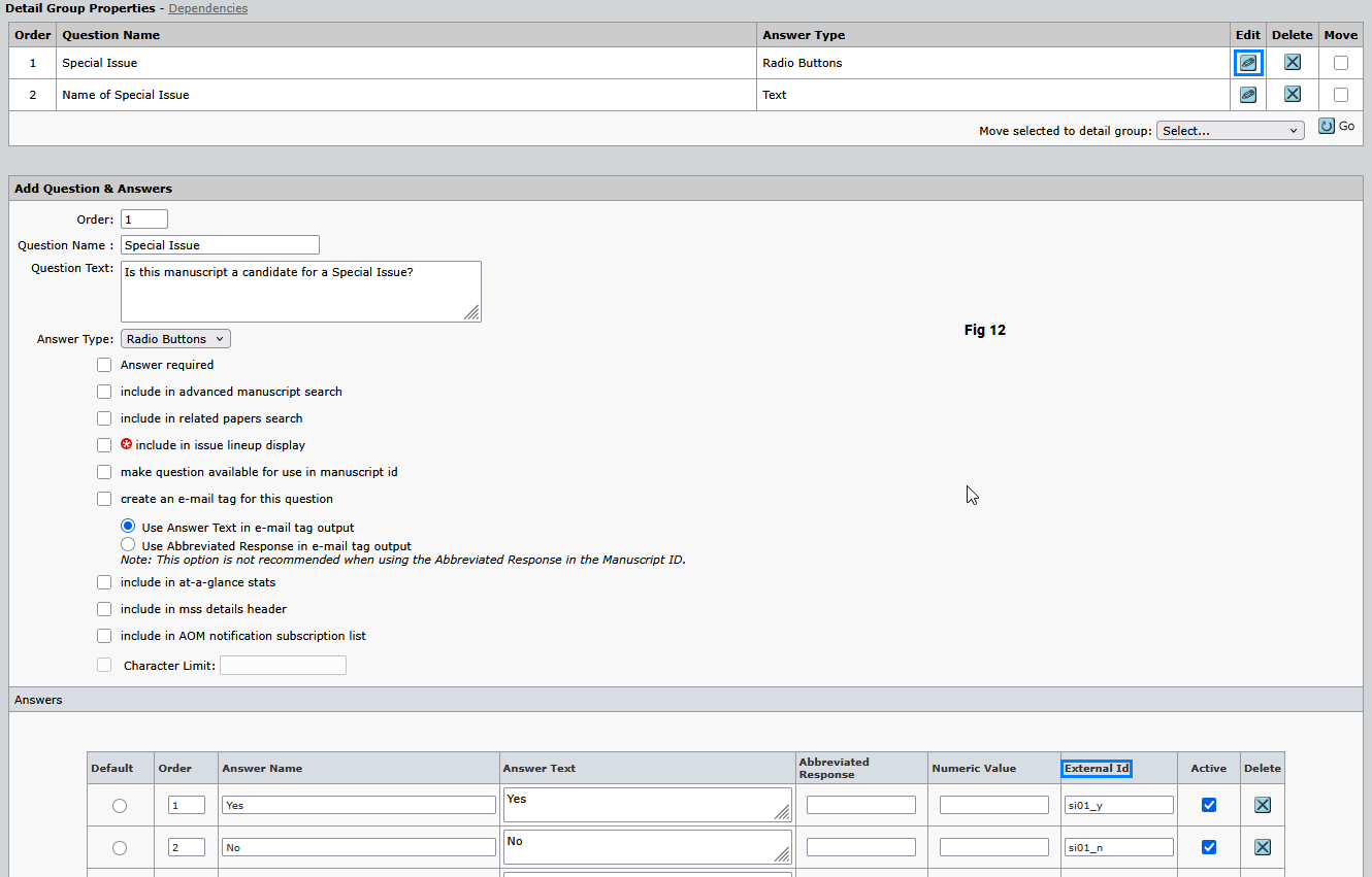 The External ID along with the Answer Name, the Answer Value and the Detail Name you noted from Fig.11 are the values needed to specify Advance View custom questions in the JATS xml. The structure is quite similar to that which we used for standard View custom questions. However, with Advanced View questions there two options for specification: One using the external id value and one without the external id. ScholarOne views use of the external ID as a best practice.