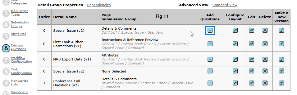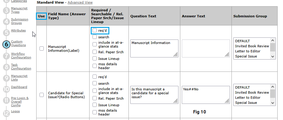 Review the Standard View questions listed on the page (Figure 10). Standard view questions are a set of pre-built question which can easily be added to a journal’s site.