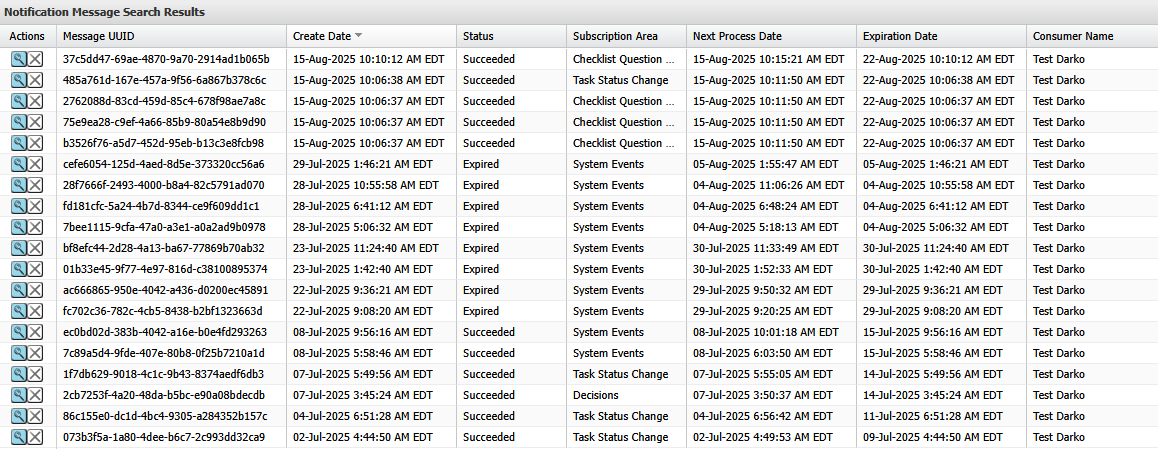Created messages matching the filter criteria are displayed in an interactive grid. From here, users can: