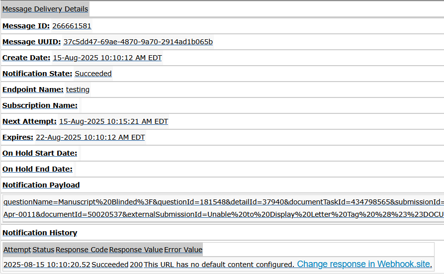 The ScholarOne Manuscripts application provides several tools for monitoring, troubleshooting, and managing message traffic. Depending on system requirements, endpoints can be defined and maintained at either the publisher (portal) level or the journal (site) level.