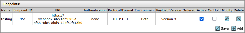 The Notification Services Endpoints view lists all configured endpoints for a given site (journal or portal). From this interface, users can manage endpoint availability, including the ability to temporarily place endpoints on hold.